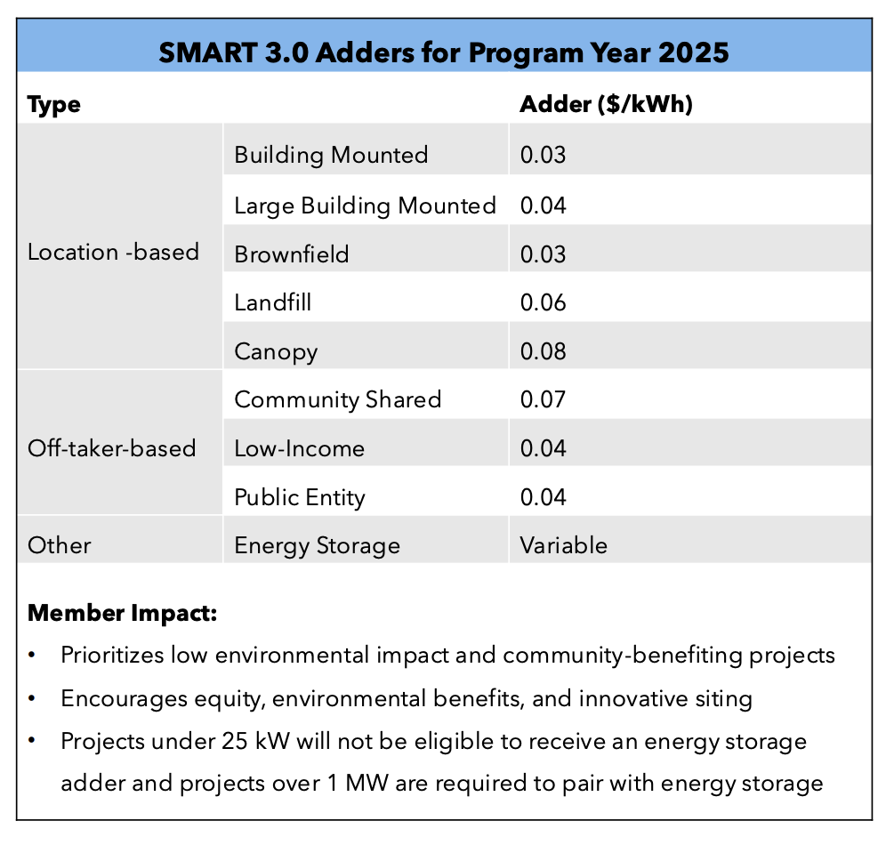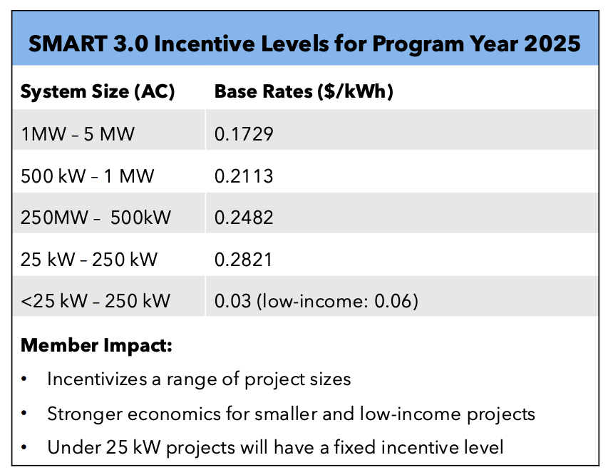 SMART 3.0 introduces higher incentives than its predecessor, SMART 2.0, arriving at a vital moment considering the sweeping changes brought by Congress’ H.R. 1, often referred to as the ‘One Big Beautiful Bill.’ SMART 3.0 now allows up to a 20% year-over-year adjustment to its annual incentives and adders, double the originally proposed 10%, to help offset the funding gap created by the federal tax credit phase-out.